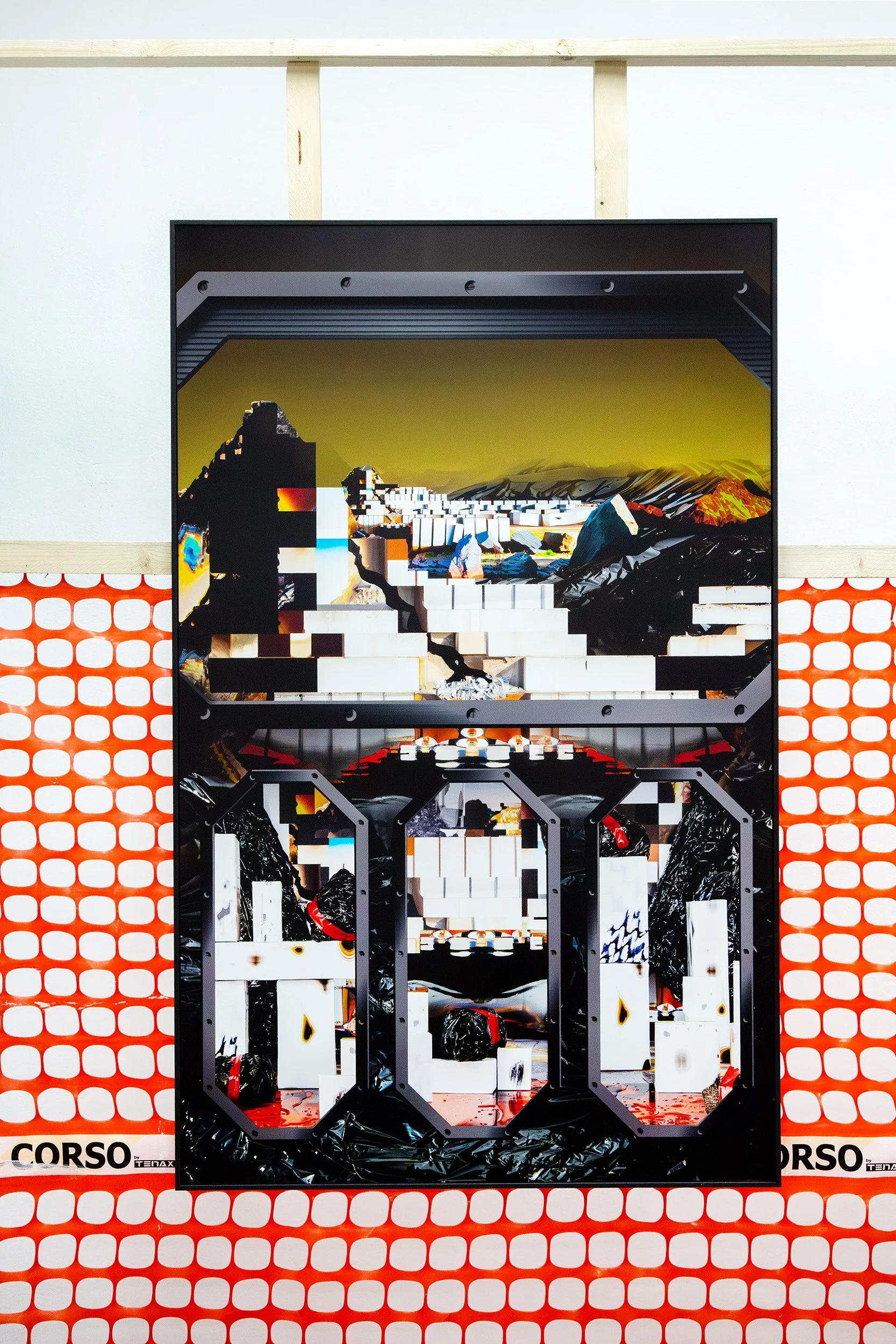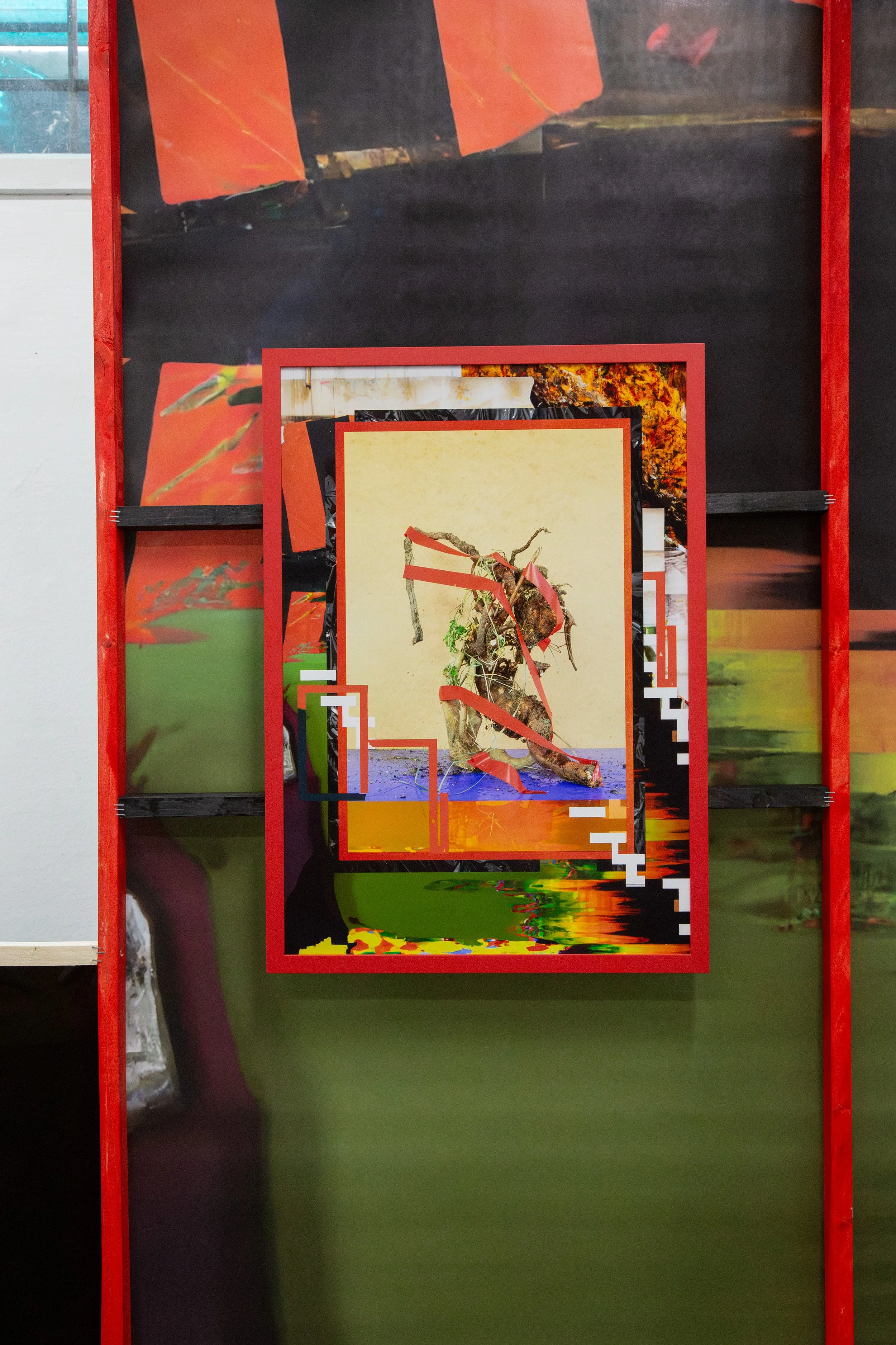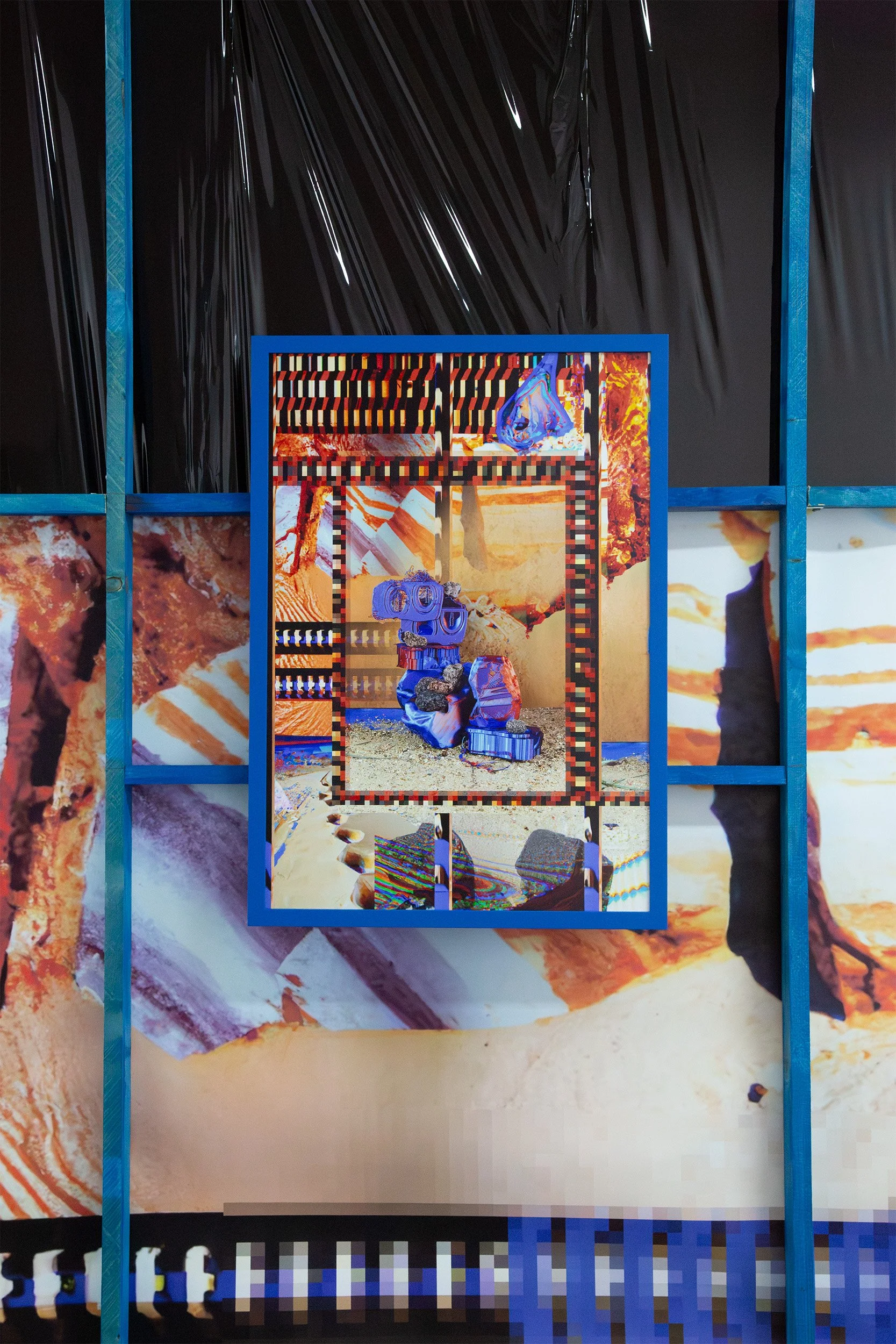 Deposits (2023) is an installation of photographic collage works which explore the relationship between data mining, mineral extraction, and the devices that enable them to meet. The images speculate on a future material, originated from the industrial waste and by-products of technological growth. Made specifically for the gallery space, the installation framework leads the viewer on a journey through upturned worlds.