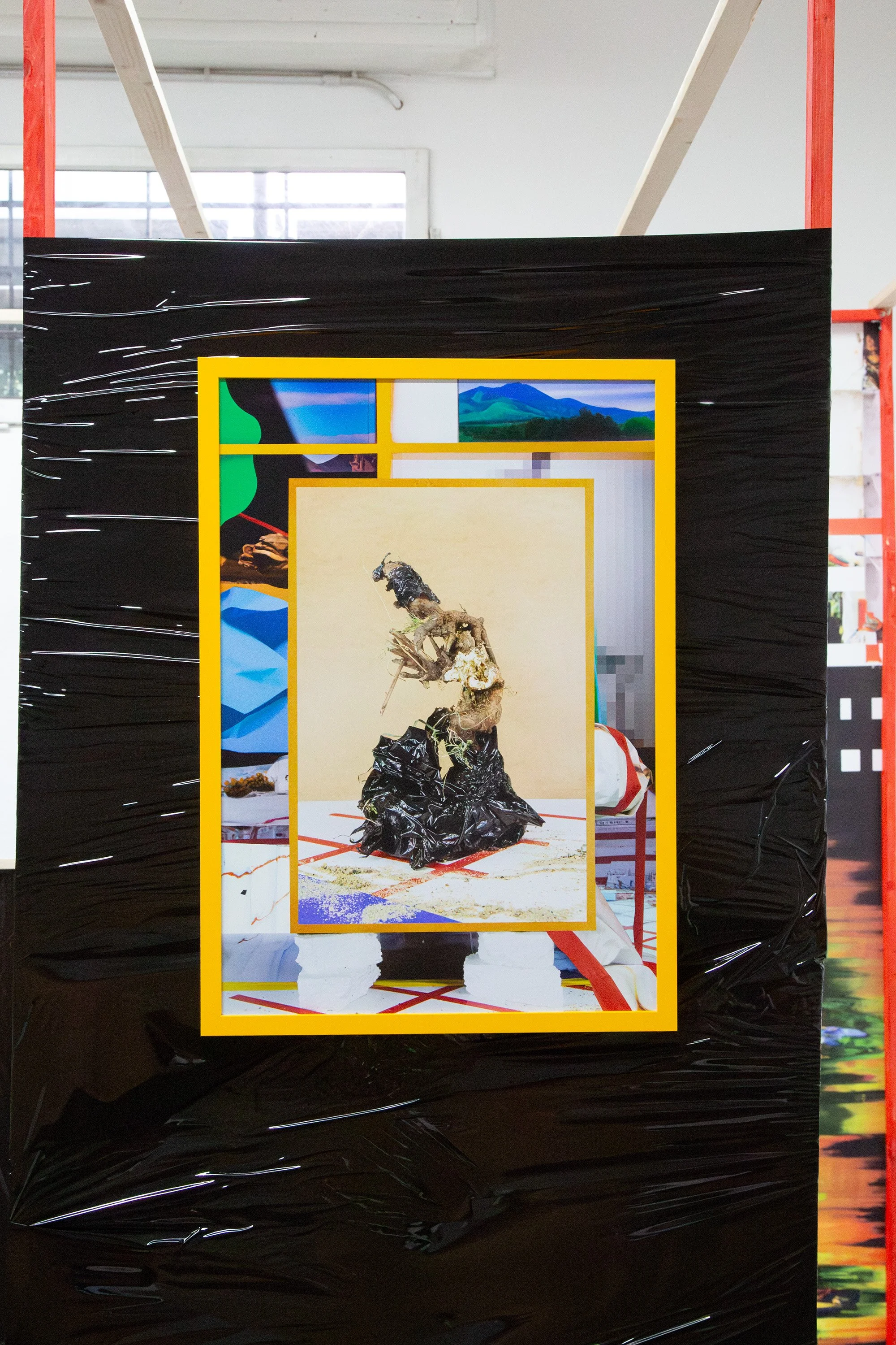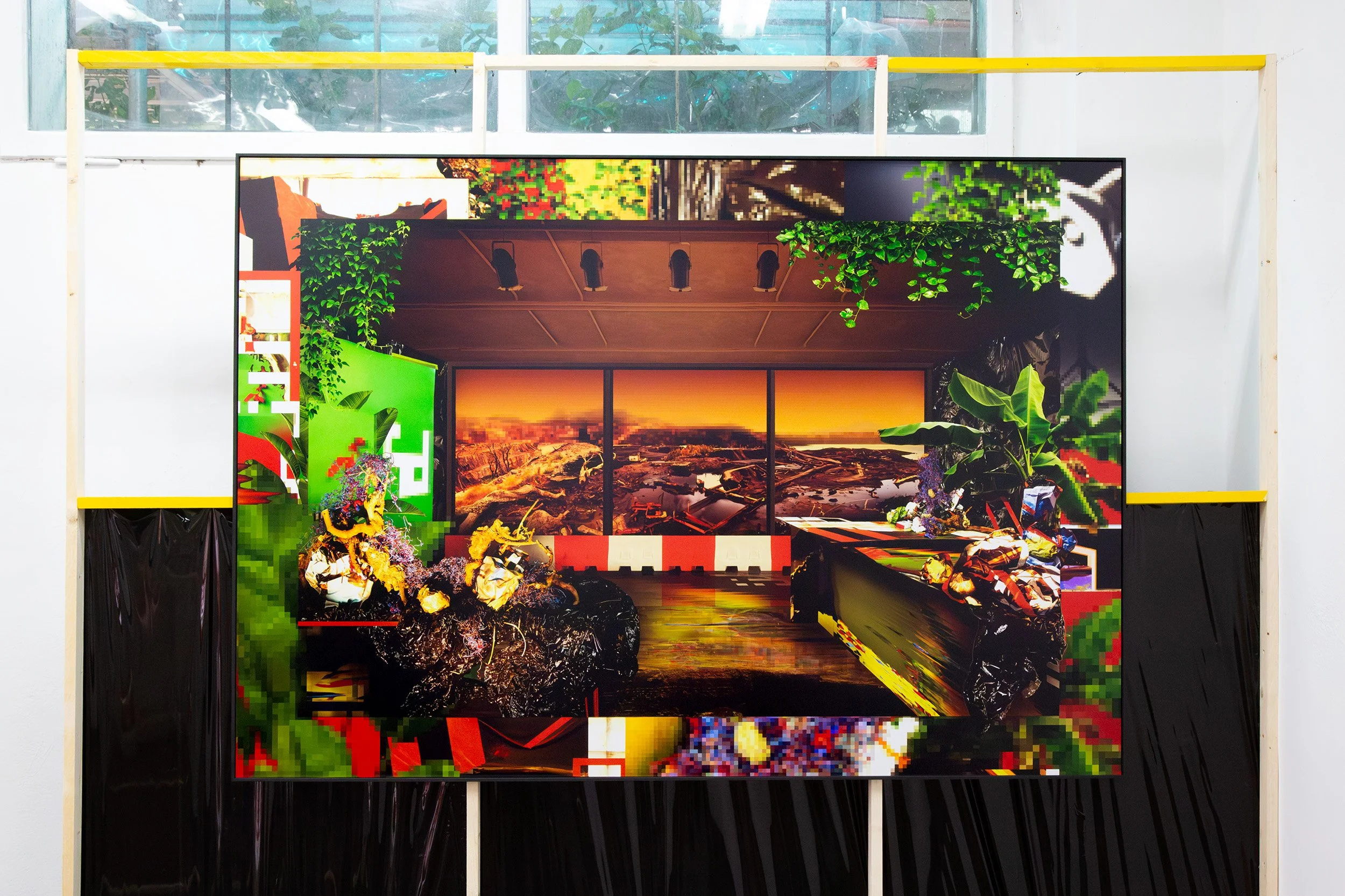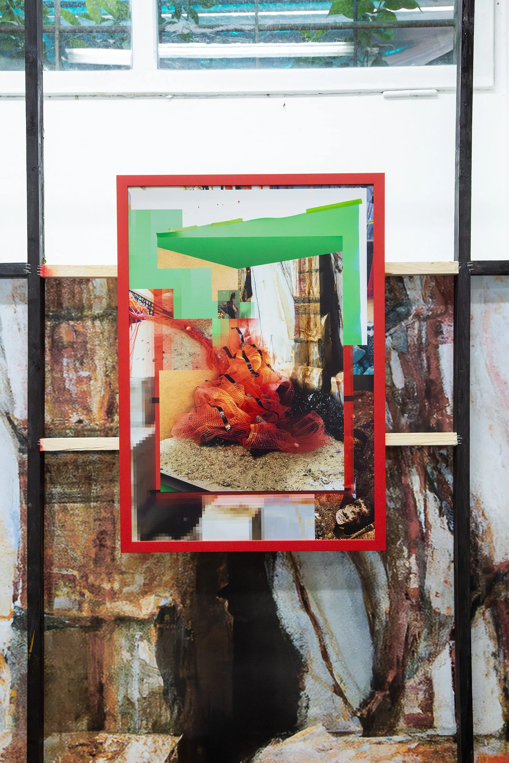 Deposits (2023) is an installation of photographic collage works which explore the relationship between data mining, mineral extraction, and the devices that enable them to meet. The images speculate on a future material, originated from the industrial waste and by-products of technological growth. Made specifically for the gallery space, the installation framework leads the viewer on a journey through upturned worlds.