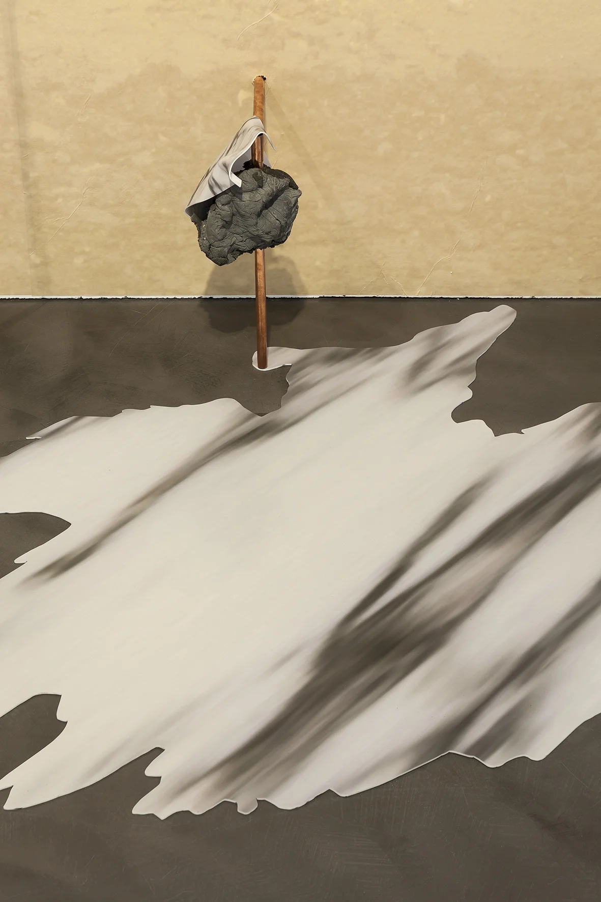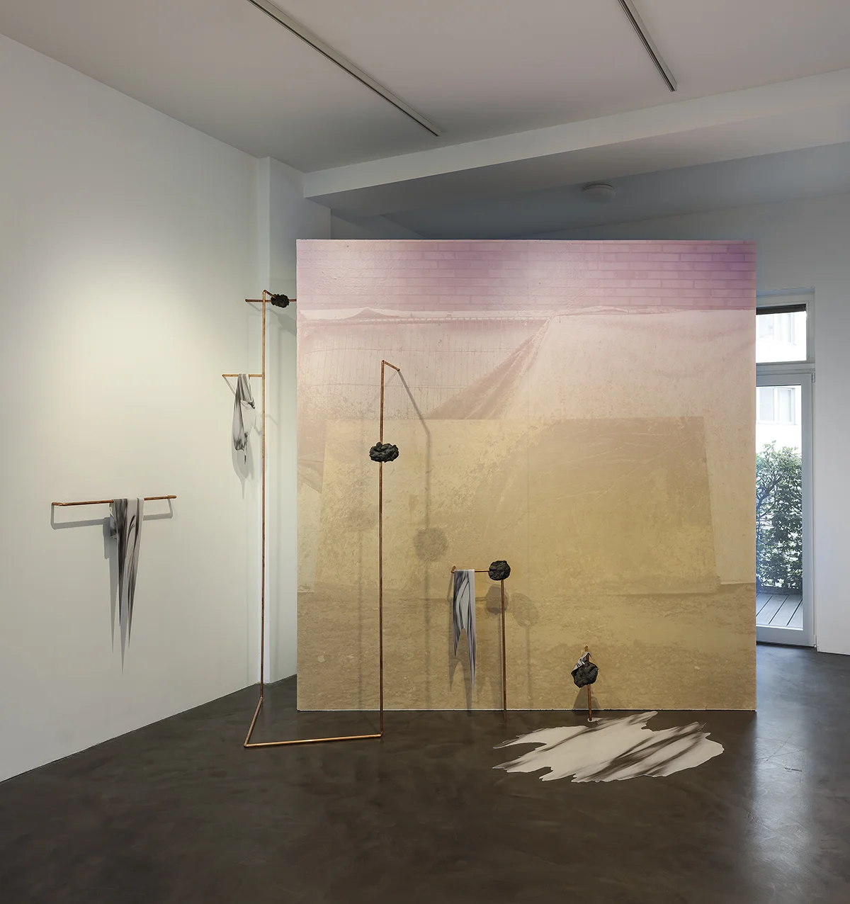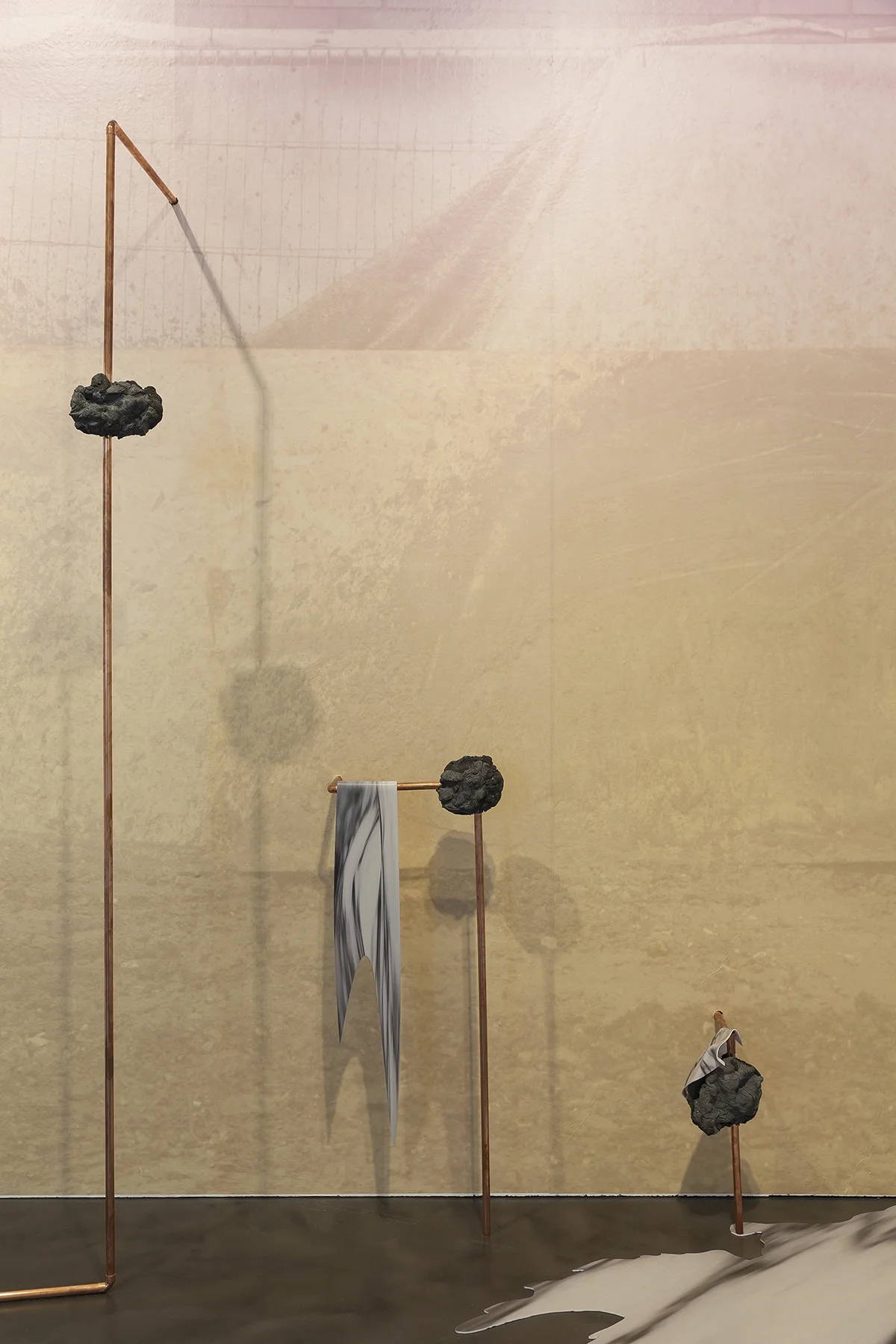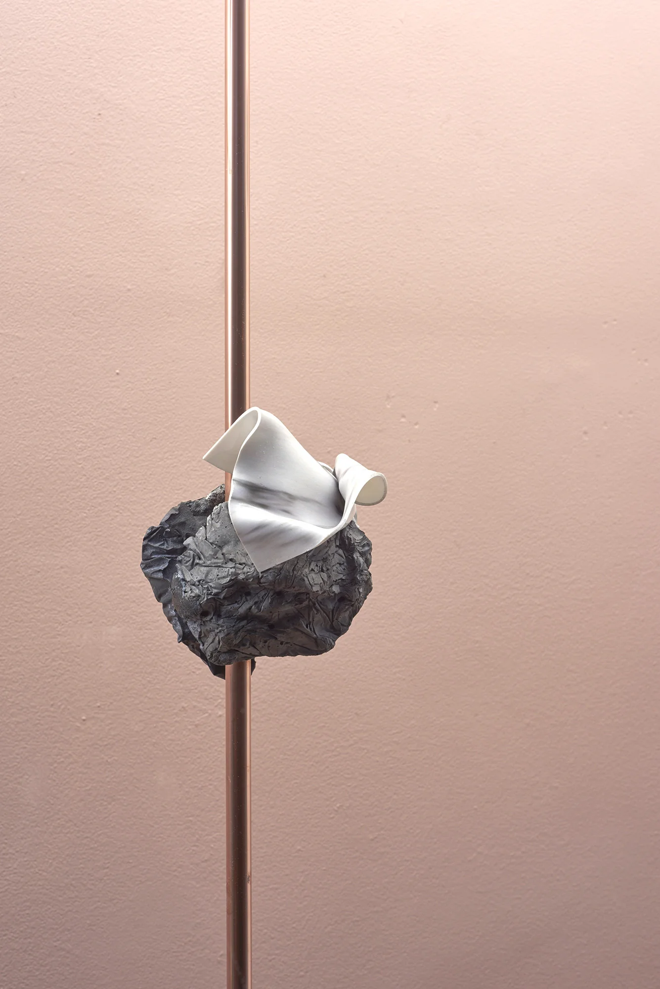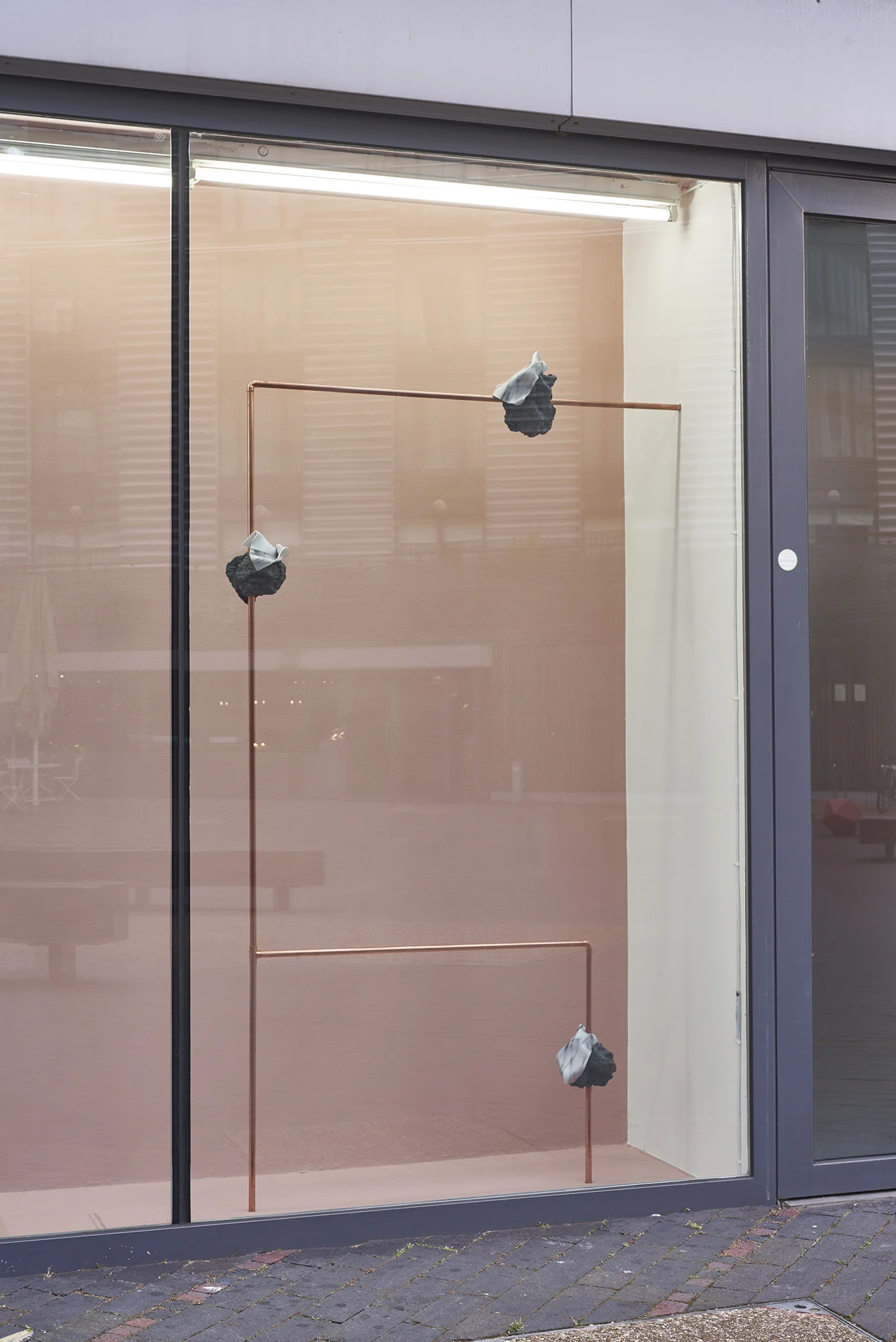 The concrete that is fused between the copper piping is made using stolen ballast from a London luxury development site. It has been cast using plastic to create a seemingly fossilised object; a relic of the former site, and a reference to its future ruin.