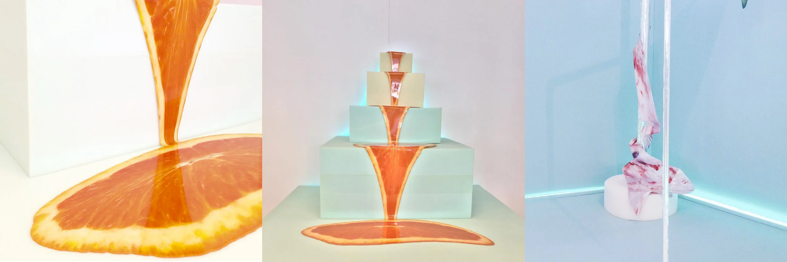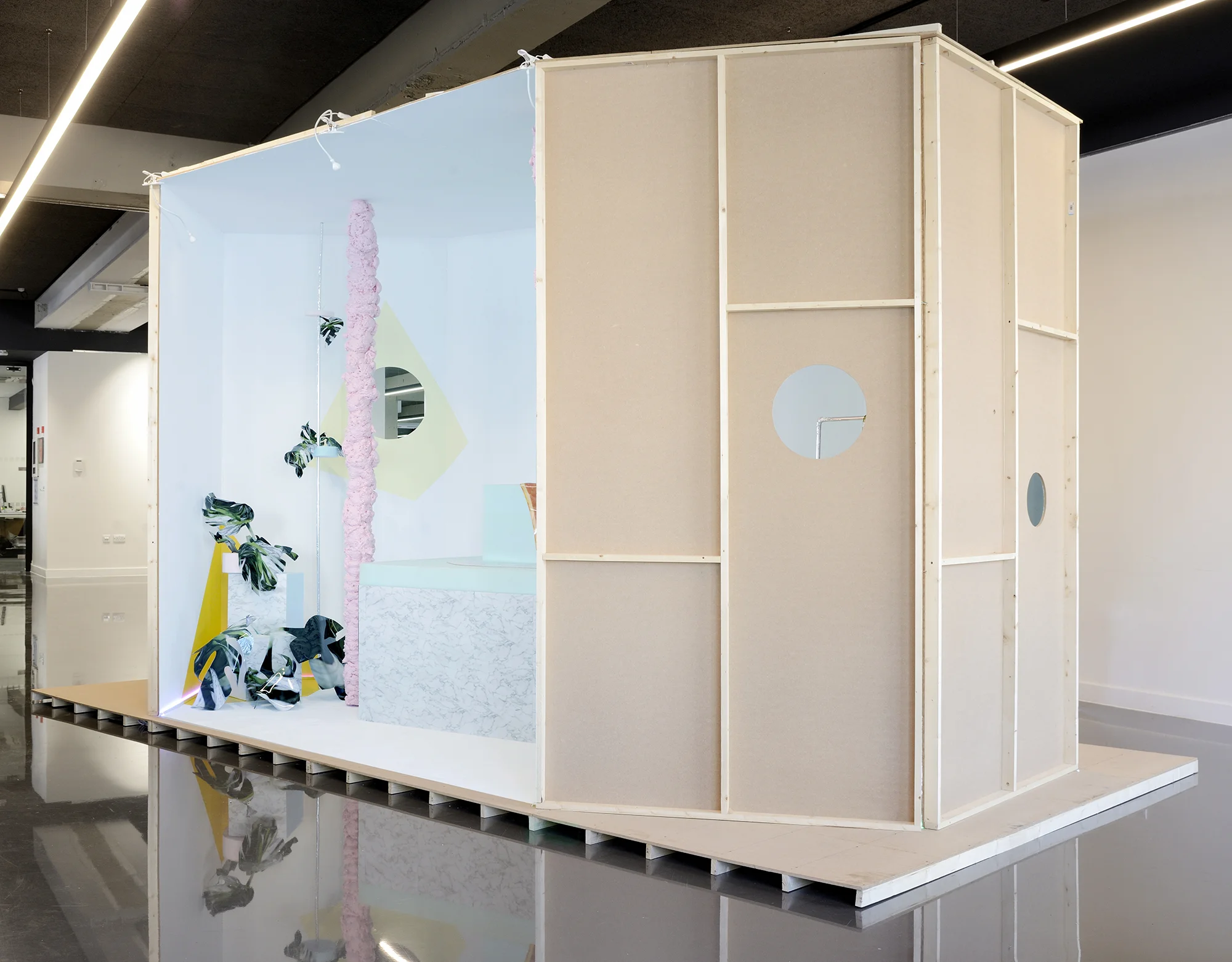 The second part of the installation is a series of ‘portals’ that are sited on the hoarding surrounding the demolished fruit market on Circus Street. This area is undergoing regeneration to become a new mixed-use ’Cultural Quarter,’ and will house another part of the University alongside new housing and businesses. The installation at the Edward Street site points to the future of Circus Street, where there will soon be ‘off-plan’ apartments for sale. The imagery used on the hoarding foresees the rendered space of the architectural proposition, whilst also considering the history of this space. Fruit and vegetable stalls will soon be replaced by imagery of luxury living; stock images of fruit bowls will be placed carefully on marble surfaces, whilst ensuring the corporate identity of the university and the development as a whole is preserved. On closer inspection however, these images will fall apart. The ‘Show Room’ at Edward Street further refers to this, by bringing the careless unconstrained proportions and warped pixels of the architectural proposition to which this hoarding challenges, into the physical space.