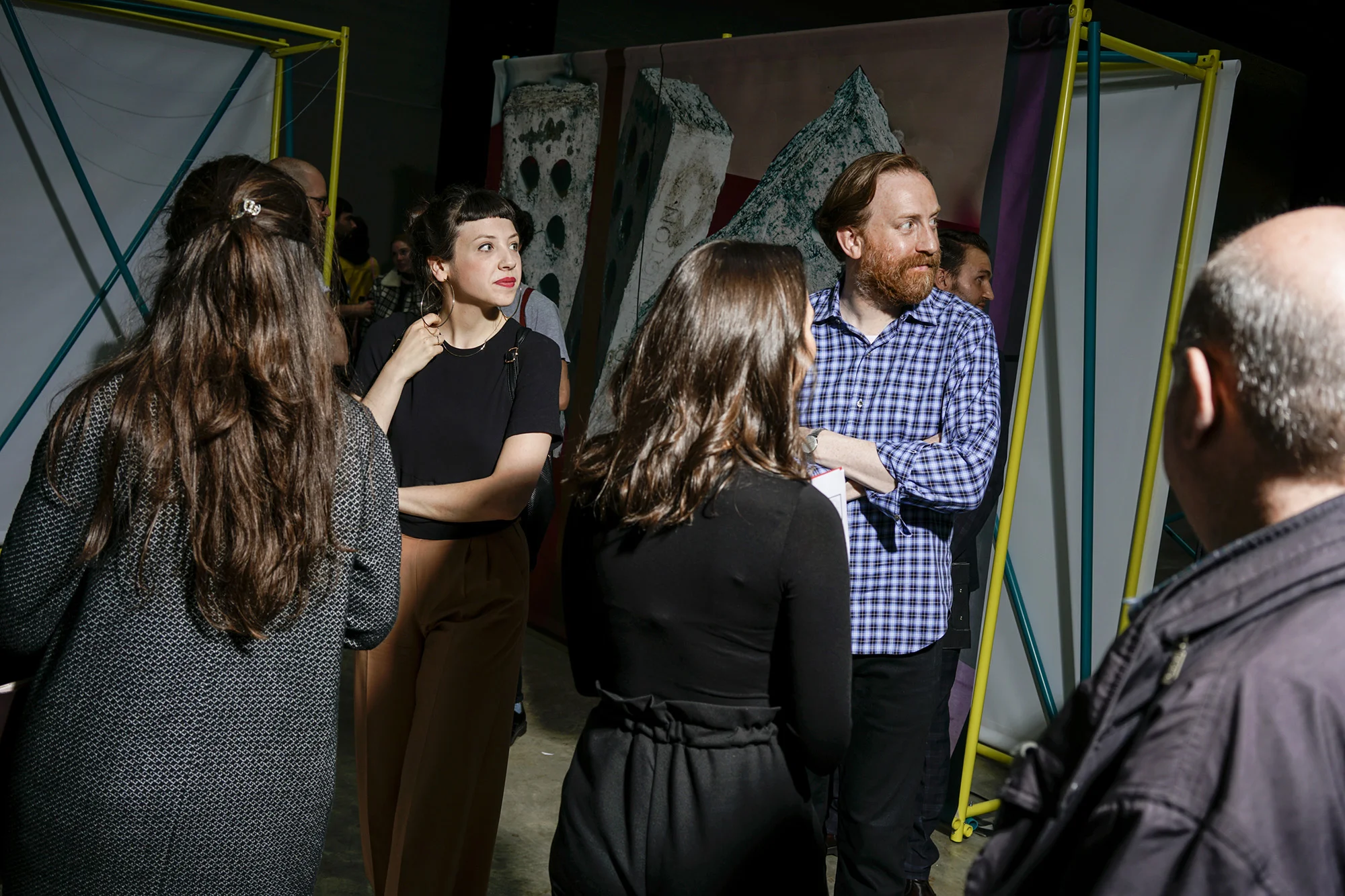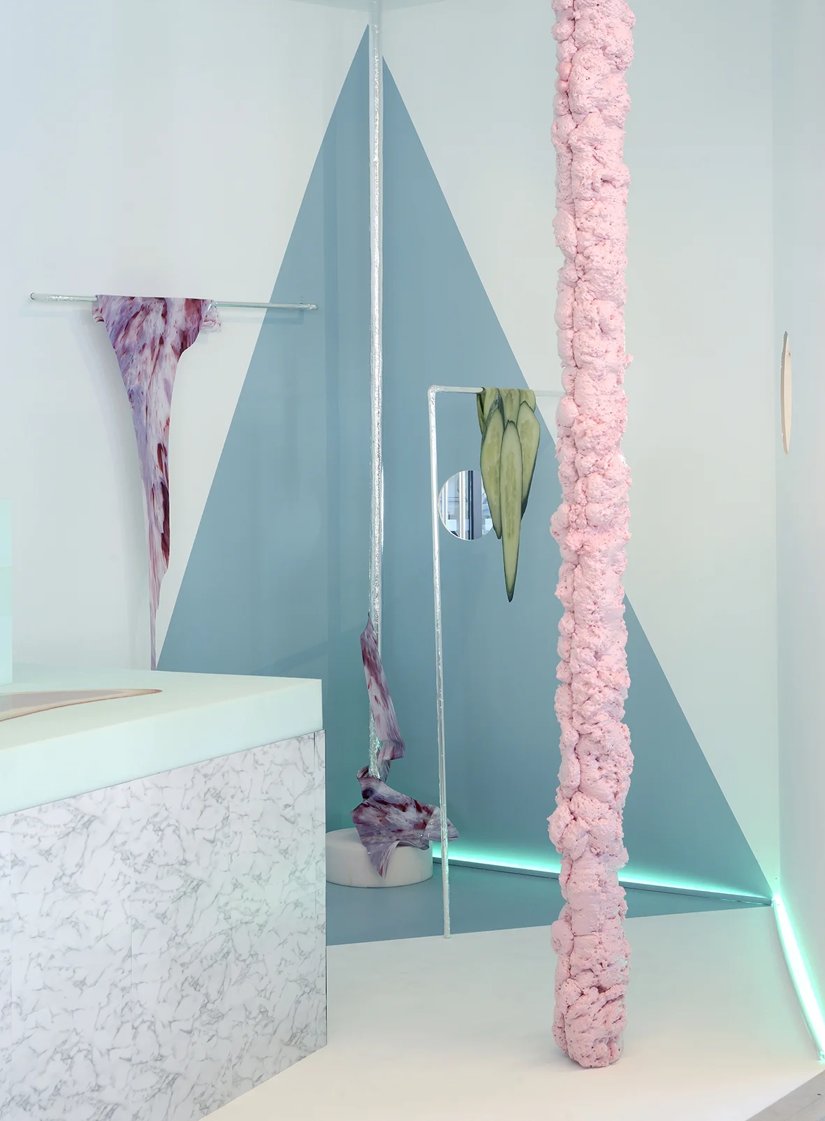 The lobby of the new campus of the University of Brighton on Edward Street houses one part of this installation. The ‘pop-up’ structure of Show Room seems apt in this space, where the campus still appears to be somewhere between construction and deconstruction, archaic and futuristic. As one traverses beyond the completed ground floor of the University and reaches the upper levels, we can experience the dismembered and seemingly forgotten areas of the building, stepping over thinned carpets and laminate boards. The installation on the ground floor points to this hybrid, whilst also considering the future of the urban terrain that surrounds it.