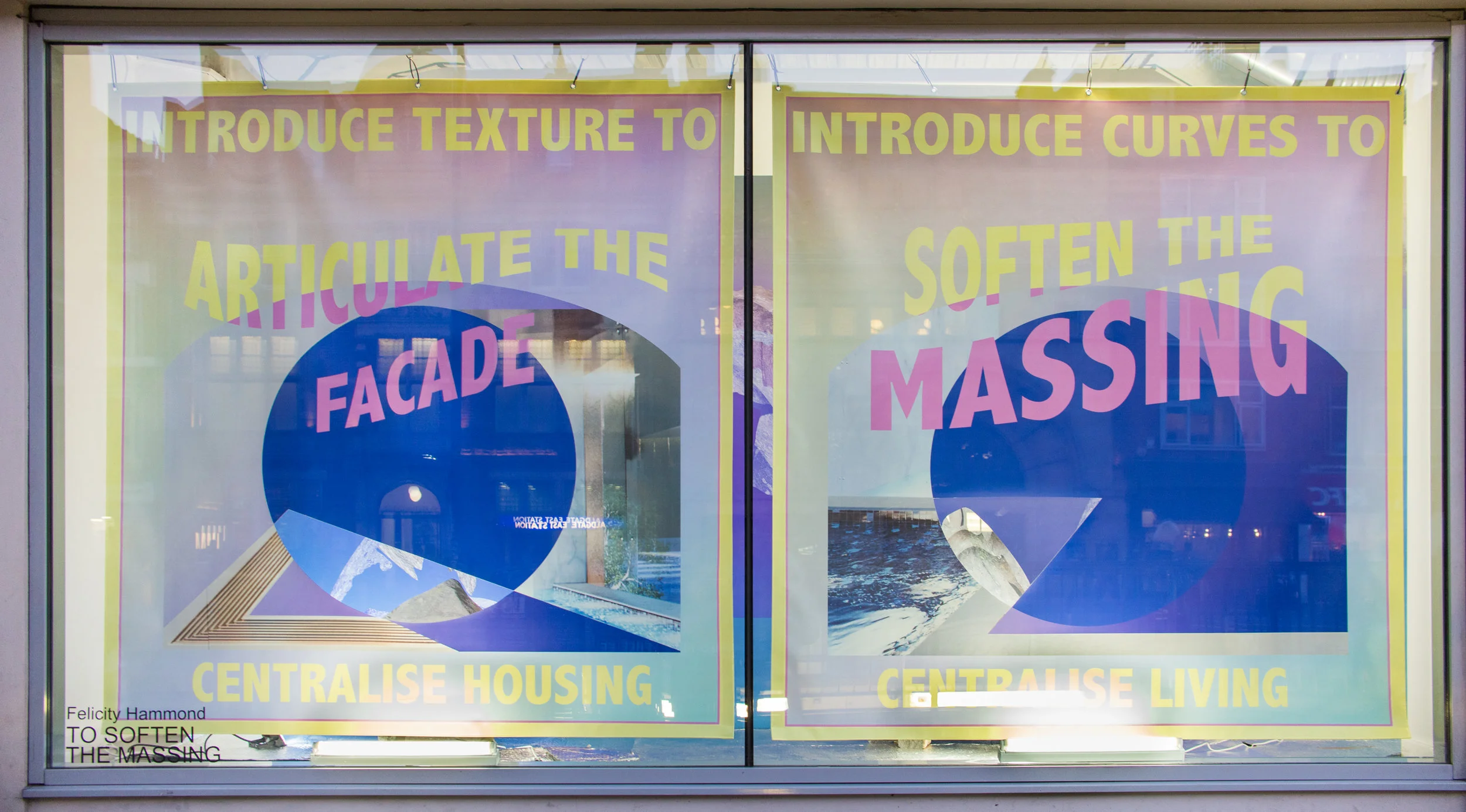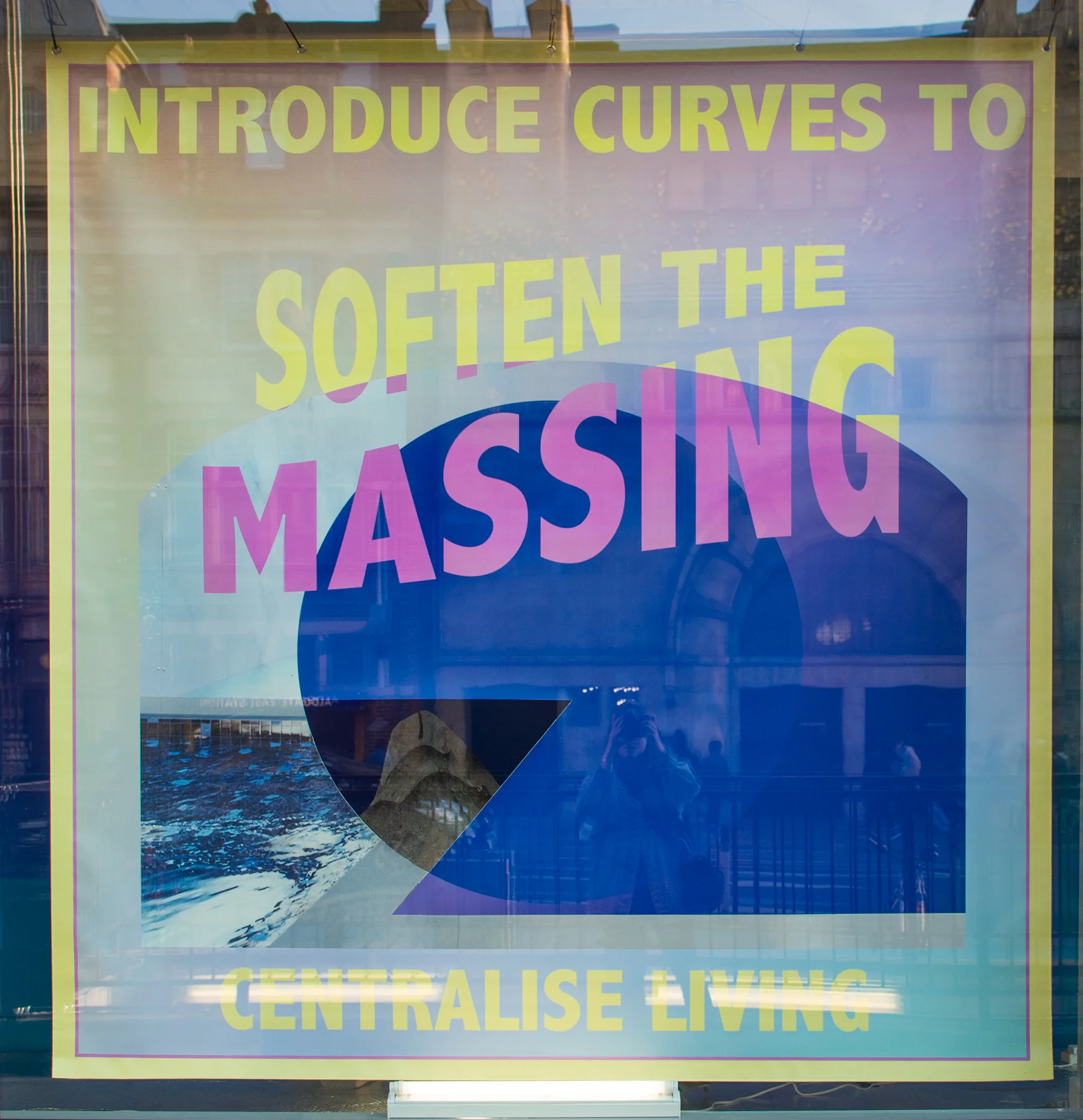 Using the images that are ubiquitous in the advertising for new developments of this kind, To Soften The Massing considers the future architectural qualities of the site, the surfaces that are at play on the façade of the building, the failure of the protest, and the hierarchies within art, education, and city planning.